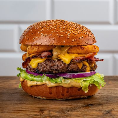 180 gramów wołowiny, krążki cebulowe, bekon, 2 x ser cheddar, sałata lodowa, czerwona cebula, sos musztarda BBQ